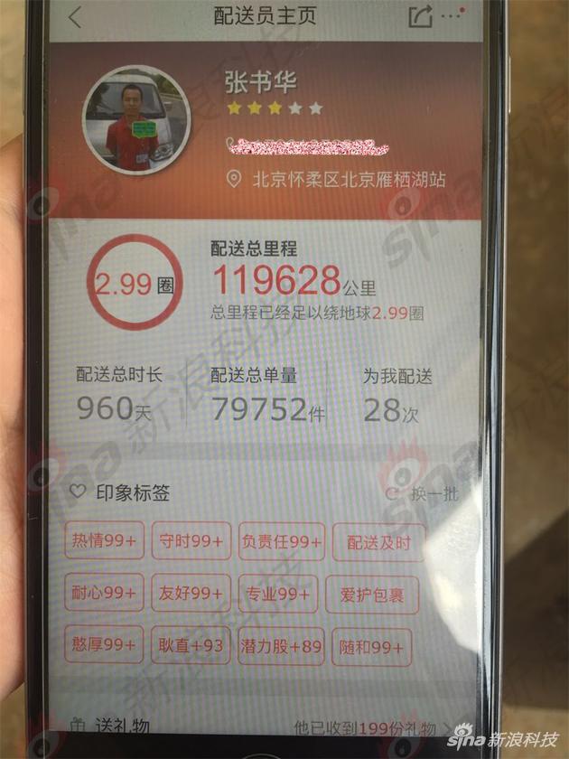 張書華是京東在雁棲湖站點的一名配送員,一般來說,北京市區(qū)的一個站點負責的區(qū)域大約是方圓十公里左右,張書華一個人負責的區(qū)域要接近50公里。在張書華的快遞員主頁上,截止2016年7月23日,他的配送總時長為960天,配送總里程119628公里,繞地球3圈。