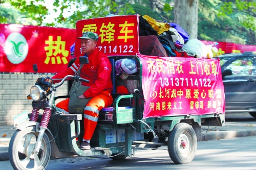 “雷鋒哥”孫德坤,河南周口扶溝縣人,20多年來一直堅(jiān)持慈善事業(yè)。每天,都能看見孫德坤的電動(dòng)三輪車“雷鋒車”穿梭于鄭州的大街小巷,將市民捐獻(xiàn)的各種物資送到需要幫助的環(huán)衛(wèi)工、農(nóng)民工、流浪人員手中。